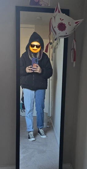It's 155cm and 50kg. It's not bad because it's loose. To wear it in the middle of winter, you need to layer up twice. It feels cheap but not bad for the price.